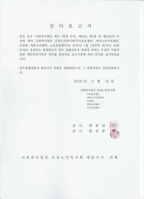 2018년 법인회계감사 보고서 페이지 정보 작성자 은천노인복지회 작성일19-02-27 14:31 조회139,203회 댓글0건 관련링크 이전글 다음글 목록 답변 본문 2018년 법인회계감사 보고서입니다. 이전글 다음글 목록 답변