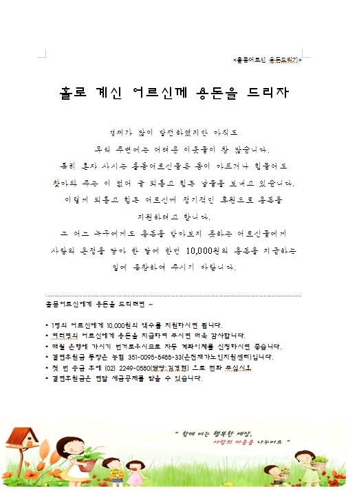 홀로계신 어르신께 용돈을 드리자 페이지 정보 작성자 은천노인복지회 작성일17-12-06 14:55 조회80,741회 댓글0건 관련링크 이전글 다음글 목록 답변 본문 홀몸 어르신께 용돈을 드리는 일에 함께 동참하여 주세요~~ 이전글 다음글 목록 답변