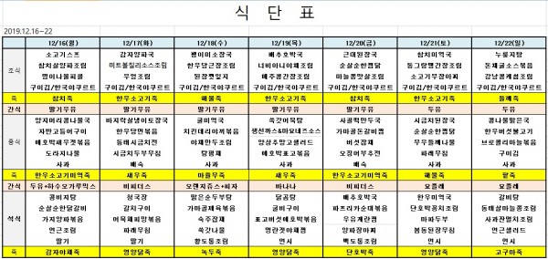 12월 셋째주 식단표 페이지 정보 작성자 은천노인복지회 작성일19-12-15 15:47 조회37,453회 댓글0건 관련링크 이전글 다음글 목록 답변 본문 ※ 모든 식사에는 잡곡밥과 김치가 제공됩니다. ※ 식단은 식재료수급에 의해 변경될 수 있습니다. 이전글 다음글 목록 답변