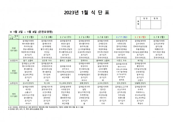 23년 1월 첫째주 식단표 페이지 정보 작성자 은천노인복지회 작성일22-12-30 15:21 조회82,574회 댓글0건 관련링크 이전글 다음글 목록 답변 본문 . 이전글 다음글 목록 답변