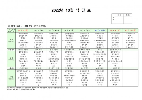 10월 첫째주 식단표 페이지 정보 작성자 은천노인복지회 작성일22-10-04 09:59 조회92,330회 댓글0건 관련링크 이전글 다음글 목록 답변 본문 . 이전글 다음글 목록 답변