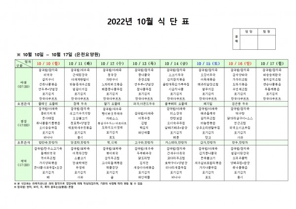 10월 둘째주 식단표 페이지 정보 작성자 은천노인복지회 작성일22-10-06 15:49 조회91,893회 댓글0건 관련링크 이전글 다음글 목록 답변 본문 . 이전글 다음글 목록 답변