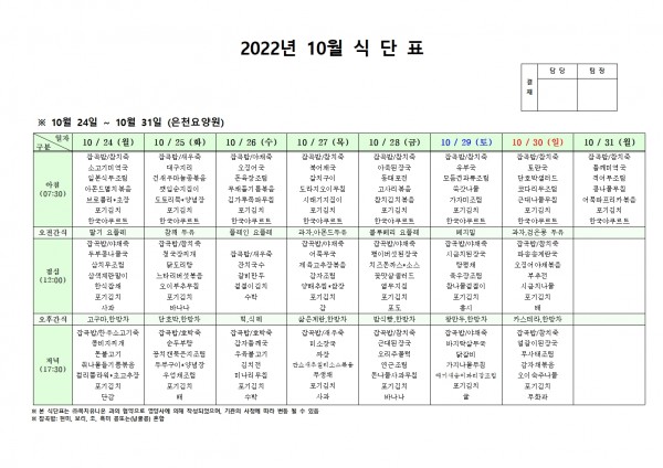 10월 넷째주 식단표 페이지 정보 작성자 은천노인복지회 작성일22-10-20 15:06 조회90,450회 댓글0건 관련링크 이전글 다음글 목록 답변 본문 . 이전글 다음글 목록 답변