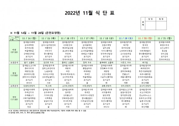 11월 셋째주 식단표 페이지 정보 작성자 은천노인복지회 작성일22-11-10 10:10 조회88,165회 댓글0건 관련링크 이전글 다음글 목록 답변 본문 . 이전글 다음글 목록 답변