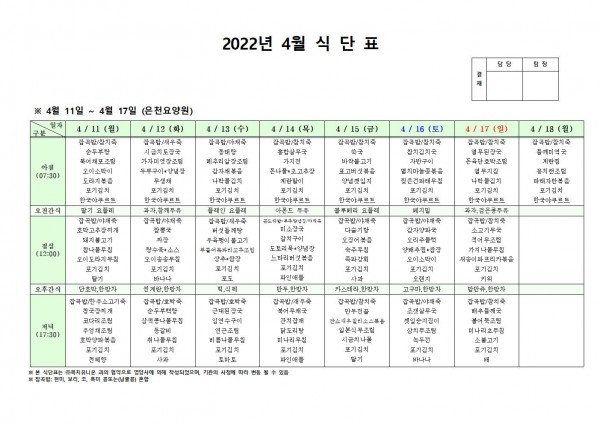 4월 둘째주 식단표 페이지 정보 작성자 은천노인복지회 작성일22-04-11 16:27 조회108,119회 댓글0건 관련링크 이전글 다음글 목록 답변 본문 . 이전글 다음글 목록 답변
