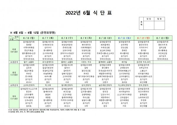 6월 둘째주 식단표 페이지 정보 작성자 은천노인복지회 작성일22-06-03 09:34 조회101,054회 댓글0건 관련링크 이전글 다음글 목록 답변 본문 . 이전글 다음글 목록 답변