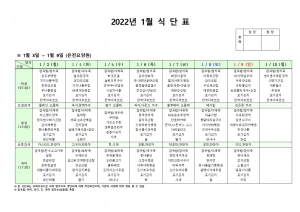 2022년 1월 첫째주 식단표 페이지 정보 작성자 은천노인복지회 작성일21-12-30 17:37 조회118,526회 댓글0건 관련링크 이전글 다음글 목록 답변 본문 . 이전글 다음글 목록 답변