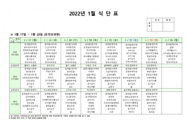 1월 셋째주 식단표 페이지 정보 작성자 은천노인복지회 작성일22-01-25 09:24 조회116,785회 댓글0건 관련링크 이전글 다음글 목록 답변 본문 . 이전글 다음글 목록 답변