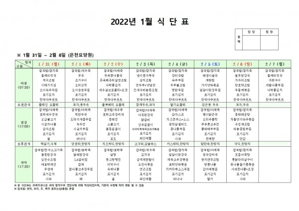 2월 첫째주 식단표 페이지 정보 작성자 은천노인복지회 작성일22-01-29 11:54 조회115,518회 댓글0건 관련링크 이전글 다음글 목록 답변 본문 . 이전글 다음글 목록 답변