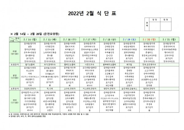 2월 셋째주 식단표 페이지 정보 작성자 은천노인복지회 작성일22-02-10 16:28 조회116,059회 댓글0건 관련링크 이전글 다음글 목록 답변 본문 . 이전글 다음글 목록 답변
