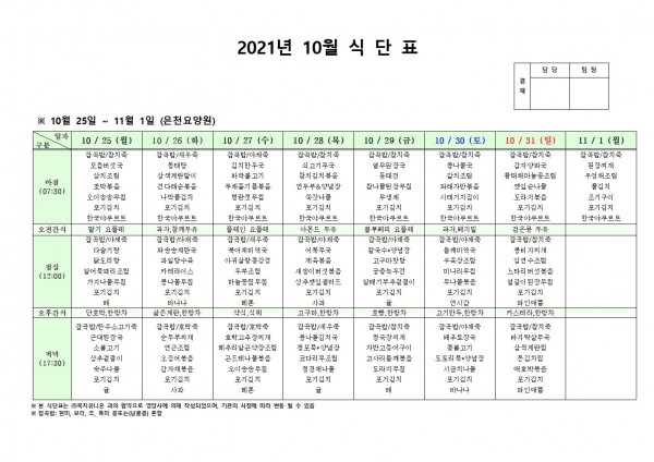 10월 넷째주 식단표 페이지 정보 작성자 은천노인복지회 작성일21-10-26 08:56 조회122,914회 댓글0건 관련링크 이전글 다음글 목록 답변 본문 . 이전글 다음글 목록 답변