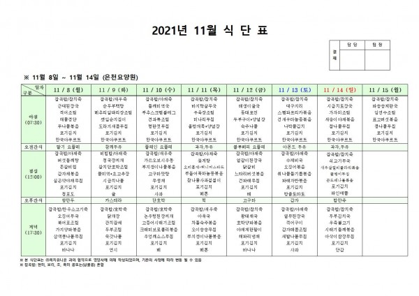11월 둘째주 식단표 페이지 정보 작성자 은천노인복지회 작성일21-11-04 16:57 조회122,974회 댓글0건 관련링크 이전글 다음글 목록 답변 본문 . 이전글 다음글 목록 답변