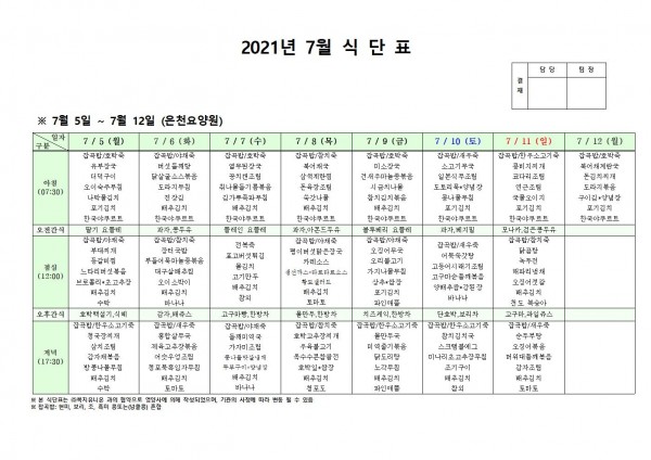 7월 첫째주 식단표 페이지 정보 작성자 은천노인복지회 작성일21-07-02 16:57 조회130,721회 댓글0건 관련링크 이전글 다음글 목록 답변 본문 . 이전글 다음글 목록 답변