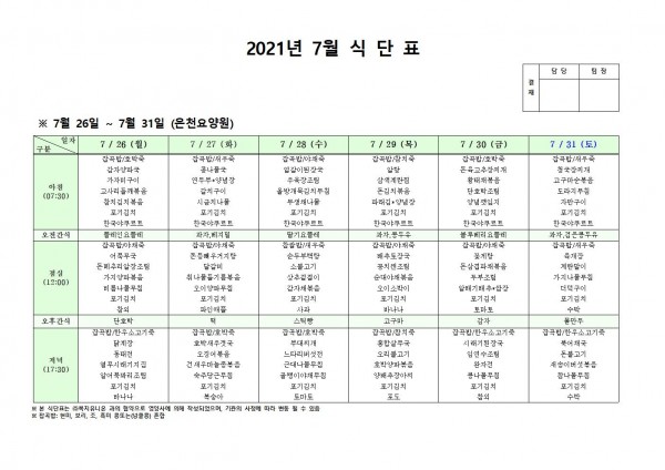7월 넷째주 식단표 페이지 정보 작성자 은천노인복지회 작성일21-08-05 10:26 조회128,419회 댓글0건 관련링크 이전글 다음글 목록 답변 본문 . 이전글 다음글 목록 답변