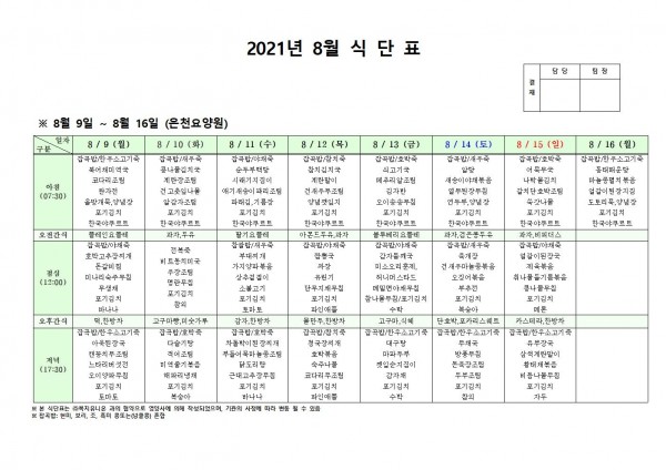 8월 둘째주 식단표 페이지 정보 작성자 은천노인복지회 작성일21-08-12 15:05 조회128,514회 댓글0건 관련링크 이전글 다음글 목록 답변 본문 . 이전글 다음글 목록 답변