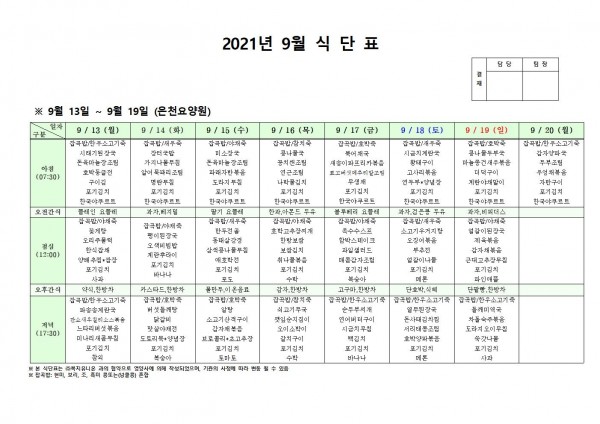 9월 셋째주 식단표 페이지 정보 작성자 은천노인복지회 작성일21-09-09 09:27 조회125,920회 댓글0건 관련링크 이전글 다음글 목록 답변 본문 . 이전글 다음글 목록 답변