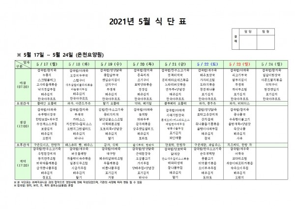 5월 셋째주 식단표 페이지 정보 작성자 은천노인복지회 작성일21-05-13 19:27 조회133,282회 댓글0건 관련링크 이전글 다음글 목록 답변 본문 5월 셋째주 식단표 이전글 다음글 목록 답변