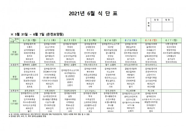 6월 첫째주 식단표 페이지 정보 작성자 은천노인복지회 작성일21-05-28 09:47 조회131,488회 댓글0건 관련링크 이전글 다음글 목록 답변 본문 . 이전글 다음글 목록 답변