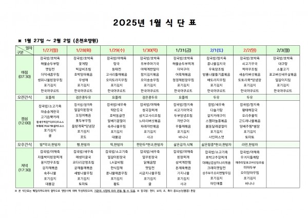 1월 다섯째주 식단표 페이지 정보 작성자 은천노인복지회 작성일25-01-24 10:07 조회13,221회 댓글0건 관련링크 이전글 다음글 목록 답변 본문 . 이전글 다음글 목록 답변