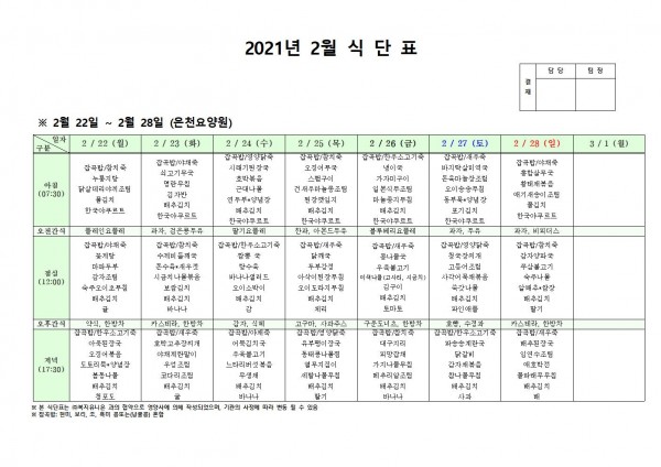 2월 넷째주 식단표 페이지 정보 작성자 은천노인복지회 작성일21-02-19 12:05 조회142,009회 댓글0건 관련링크 이전글 다음글 목록 답변 본문 2월 4주 식단표 [이 게시물은 은천노인복지회님에 의해 2021-03-12 17:18:24 공지사항에서 이동 됨] 이전글 다음글 목록 답변