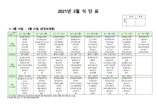 3월 셋째주 식단표 페이지 정보 작성자 은천노인복지회 작성일21-03-12 11:41 조회140,546회 댓글0건 관련링크 이전글 다음글 목록 답변 본문 3월 셋째주 식단표[이 게시물은 은천노인복지회님에 의해 2021-03-12 17:18:24 공지사항에서 이동 됨] 이전글 다음글 목록 답변