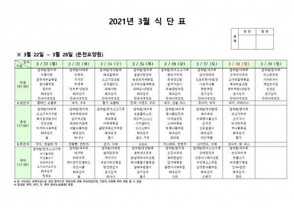 3월 넷째주 식단표 페이지 정보 작성자 은천노인복지회 작성일21-03-18 17:41 조회140,332회 댓글0건 관련링크 이전글 다음글 목록 답변 본문 3월 넷째주 식단표 이전글 다음글 목록 답변