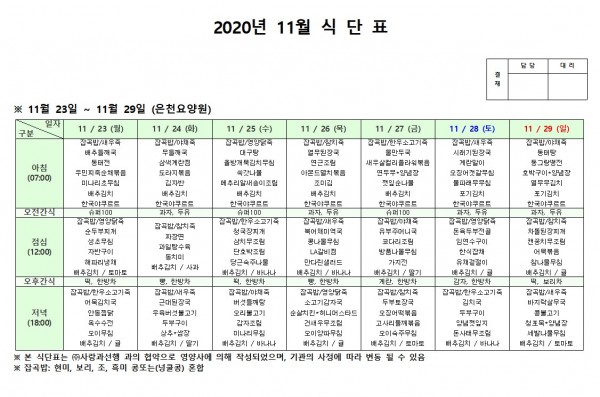 11월 넷째주 식단표 페이지 정보 작성자 은천노인복지회 작성일20-12-08 18:10 조회150,715회 댓글0건 관련링크 이전글 다음글 목록 답변 본문 . 이전글 다음글 목록 답변