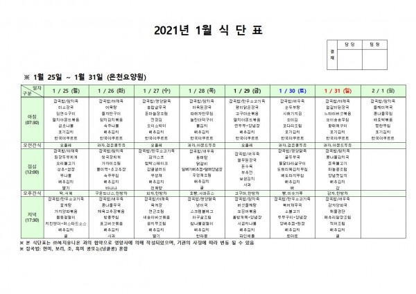 1월 넷째주 식단표 페이지 정보 작성자 은천노인복지회 작성일21-01-22 10:43 조회145,257회 댓글0건 관련링크 이전글 다음글 목록 답변 본문 . 이전글 다음글 목록 답변