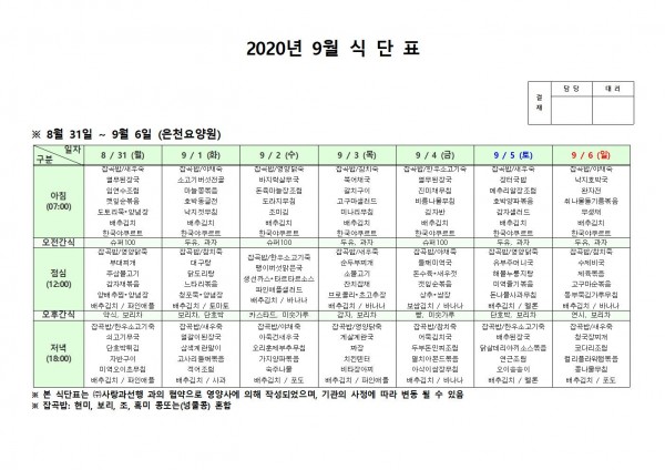9월 첫째주 식단표 페이지 정보 작성자 은천노인복지회 작성일20-09-07 14:40 조회159,405회 댓글0건 관련링크 이전글 다음글 목록 답변 본문 * 이전글 다음글 목록 답변