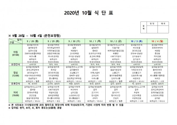 10월 첫째주 식단표 페이지 정보 작성자 은천노인복지회 작성일20-10-12 14:45 조회156,796회 댓글0건 관련링크 이전글 다음글 목록 답변 본문 . 이전글 다음글 목록 답변