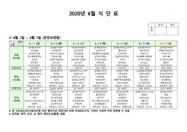 6월 첫째주 식단표 페이지 정보 작성자 은천노인복지회 작성일20-06-09 09:32 조회167,335회 댓글0건 관련링크 이전글 다음글 목록 답변 본문 호 이전글 다음글 목록 답변