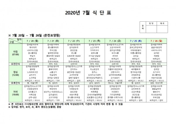 7월 넷째주 식단표 페이지 정보 작성자 은천노인복지회 작성일20-08-10 11:31 조회162,770회 댓글0건 관련링크 이전글 다음글 목록 답변 본문 . 이전글 다음글 목록 답변