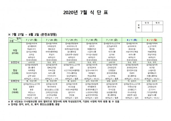7월 다섯째주 식단표 페이지 정보 작성자 은천노인복지회 작성일20-08-10 11:32 조회161,986회 댓글0건 관련링크 이전글 다음글 목록 답변 본문 . 이전글 다음글 목록 답변