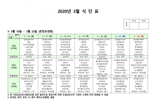 3월 셋째주 식단표 페이지 정보 작성자 은천노인복지회 작성일20-03-23 14:50 조회177,202회 댓글0건 관련링크 이전글 다음글 목록 답변 본문 . 이전글 다음글 목록 답변