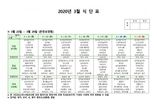 3월 넷째주 식단표 페이지 정보 작성자 은천노인복지회 작성일20-03-31 16:09 조회176,597회 댓글0건 관련링크 이전글 다음글 목록 답변 본문 . 이전글 다음글 목록 답변