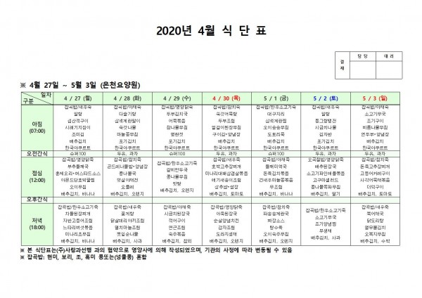 4월 넷째주 식단표 페이지 정보 작성자 은천노인복지회 작성일20-05-04 15:11 조회171,437회 댓글0건 관련링크 이전글 다음글 목록 답변 본문 . 이전글 다음글 목록 답변