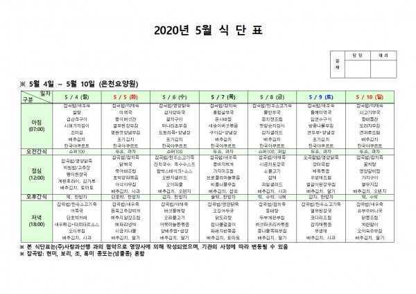 5월 첫째주 식단표 페이지 정보 작성자 은천노인복지회 작성일20-05-18 16:01 조회169,495회 댓글0건 관련링크 이전글 다음글 목록 답변 본문 . 이전글 다음글 목록 답변