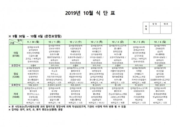 10월 첫째주 식단표 페이지 정보 작성자 은천노인복지회 작성일19-10-07 15:21 조회190,972회 댓글0건 관련링크 이전글 다음글 목록 답변 본문 10월 첫째주 식단표 이전글 다음글 목록 답변