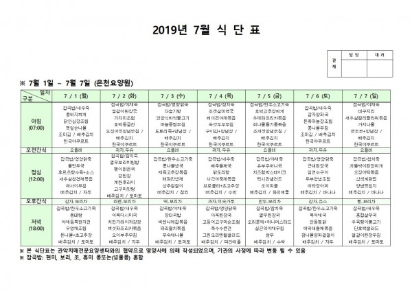 7월 첫째주 식단표 페이지 정보 작성자 은천노인복지회 작성일19-07-08 11:21 조회196,424회 댓글0건 관련링크 이전글 다음글 목록 답변 본문 7월 첫째주 식단표 이전글 다음글 목록 답변
