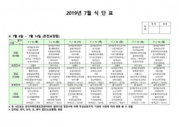 7월 둘째주 식단표 페이지 정보 작성자 은천노인복지회 작성일19-07-15 10:56 조회195,232회 댓글0건 관련링크 이전글 다음글 목록 답변 본문 7월 둘째주 식단표 이전글 다음글 목록 답변