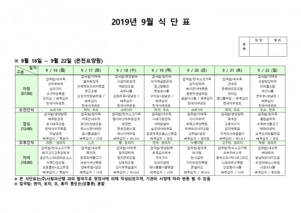 9월 셋째주 식단표 페이지 정보 작성자 은천노인복지회 작성일19-09-23 13:27 조회192,627회 댓글0건 관련링크 이전글 다음글 목록 답변 본문 . 이전글 다음글 목록 답변