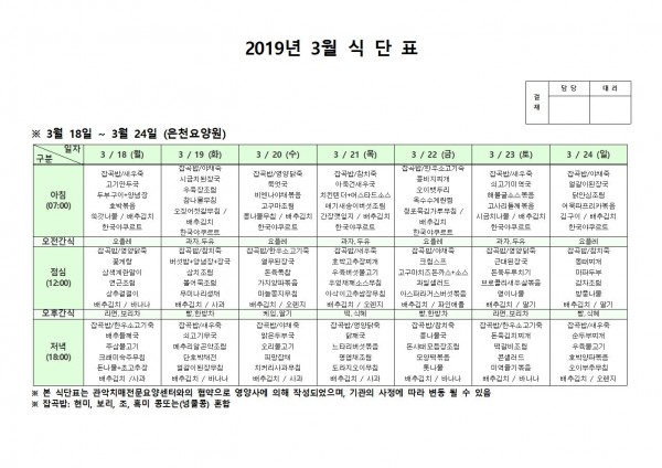 3월 셋째주 식단표 페이지 정보 작성자 은천노인복지회 작성일19-03-25 11:11 조회201,906회 댓글0건 관련링크 이전글 다음글 목록 답변 본문 3월 셋째주 식단표 이전글 다음글 목록 답변