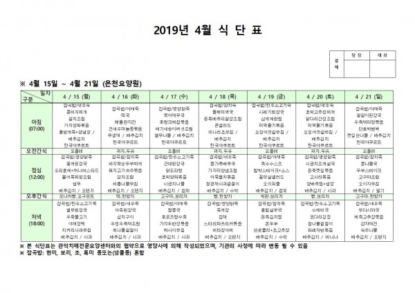 4월 셋째주 식단표 페이지 정보 작성자 은천노인복지회 작성일19-04-22 13:22 조회202,191회 댓글0건 관련링크 이전글 다음글 목록 답변 본문 4월 셋째주 식단표 이전글 다음글 목록 답변