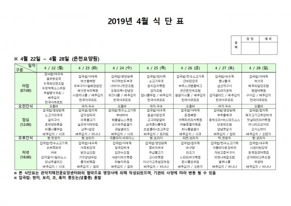 4월 넷째주 식단표 페이지 정보 작성자 은천노인복지회 작성일19-04-29 10:14 조회202,713회 댓글0건 관련링크 이전글 다음글 목록 답변 본문 4월 넷째주 식단표 이전글 다음글 목록 답변