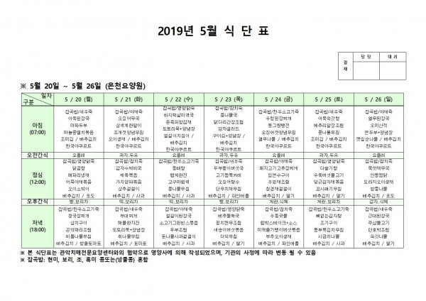 5월 셋째주 식단표 페이지 정보 작성자 은천노인복지회 작성일19-05-27 14:07 조회199,413회 댓글0건 관련링크 이전글 다음글 목록 답변 본문 5월 셋째주 식단표 이전글 다음글 목록 답변