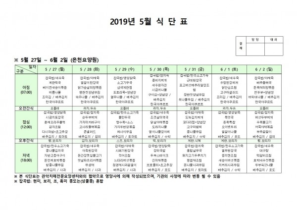 5월 넷째주 식단표 페이지 정보 작성자 은천노인복지회 작성일19-06-10 11:56 조회199,093회 댓글0건 관련링크 이전글 다음글 목록 답변 본문 5월 넷째주 식단표 이전글 다음글 목록 답변