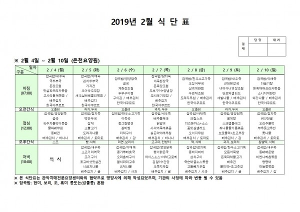 2월 첫째주 식단표 페이지 정보 작성자 은천노인복지회 작성일19-02-13 17:29 조회203,431회 댓글0건 관련링크 이전글 다음글 목록 답변 본문 2월 첫째주 식단표 이전글 다음글 목록 답변