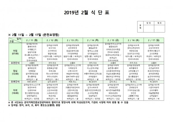 2월 둘째주 식단표 페이지 정보 작성자 은천노인복지회 작성일19-02-13 17:30 조회204,158회 댓글0건 관련링크 이전글 다음글 목록 답변 본문 2월 둘째주 식단표 이전글 다음글 목록 답변
