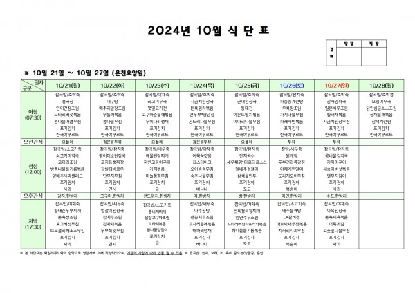 10월 넷째주 식단표 페이지 정보 작성자 은천노인복지회 작성일24-10-18 10:37 조회18,321회 댓글0건 관련링크 이전글 다음글 목록 답변 본문 . 이전글 다음글 목록 답변