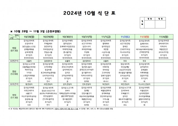 10월 다섯째 주 식단표 페이지 정보 작성자 은천노인복지회 작성일24-10-24 15:18 조회18,162회 댓글0건 관련링크 이전글 다음글 목록 답변 본문 . 이전글 다음글 목록 답변